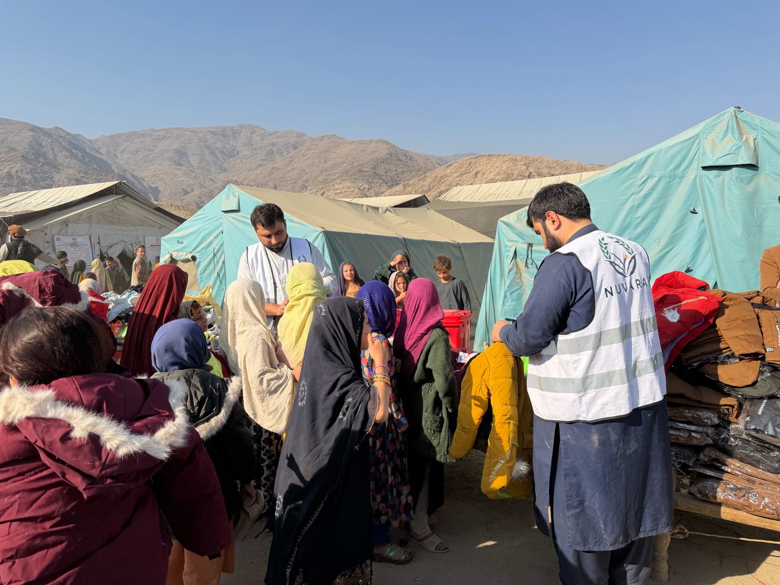 Hilfspakete mit Lebensmitteln, Wasser, Hygiene oder Bildungsmaterialien, die an bedürftige Familien verteilt wurden.